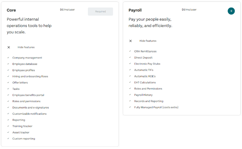 Wagepoint’s pricing is fairly straightforward with a base fee per pay run plus $2 per employee per pay run.